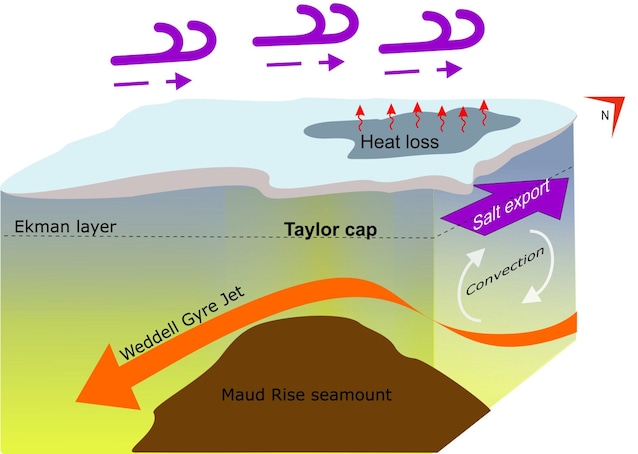 Lo studio dei ricercatori ha mostrato come la formazione di una polynya dipenda dalla concomitanza di diversi fattori. Tra questi vi è il rafforzamento della corrente oceanica che si muove in modo circolare intorno al Mare di Weddell (chiamata Weddell Gyre), il quale determina il fenomeno chiamato upwelling: l’acqua più calda e salata che scorre in profondità risale in superficie, mescolandosi con quella superficiale. Quest’ultima diventa più salata e si riscalda: il sale abbassa la temperatura di congelamento dell’acqua, quindi il ghiaccio marino sovrastante può fondere originando un buco. Fondendo, però, il ghiaccio dovrebbe abbassare la temperatura delle acque superficiali e interrompere quindi il fenomeno. I ricercatori hanno scoperto che se questo non accade subito è grazie a un processo chiamato “trasporto di Ekman”. Questo processo consiste nel trasporto di acqua dovuto all’interazione tra il vento e la superficie oceanica. Questo trasporto fa risalire anche i sali accumulati dai vortici della corrente oceanica sulla cima della montagna sottomarina Maud Rise. Il risultato è un maggiore apporto di sali, ma anche di calore, nelle acque superficiali.