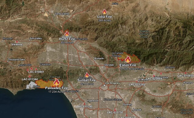 Come confermato dal CAL FIRE (Department of Forestry and Fire Protection) californiano, al momento sono 5 i roghi principali nell'area: Palisades, tra Santa Monica e Malibu (circa 7000 ettari); Eaton, sopra Pasadena (4300 ettari); Hurst, sopra San Fernando (271 ettari); Lidia, a nord della foresta nazionale (140 ettari); Sunset, nelle colline di Hollywood (17 ettari).