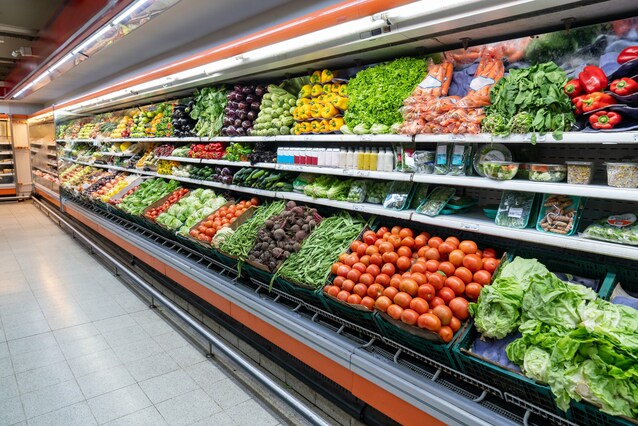 Disposizione dei prodotti al supermercato: frutta, verdura e pane per primi