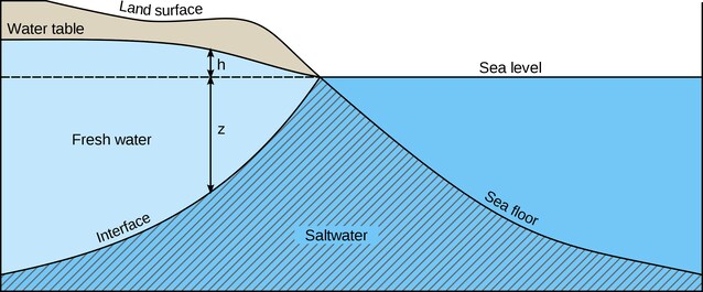 Perché si parla di cuneo? L’acqua dolce, essendo meno densa dell'acqua salata, tende a galleggiare. L’acqua marina invece s’infila sotto. A livello grafico, sui libri universitari per esempio, il cuneo è rappresentato con un'interfaccia netta tra acqua marina e acqua dolce (nella figura qui sotto è quello indicato con il pattern a striscioline e la scritta "salt water").