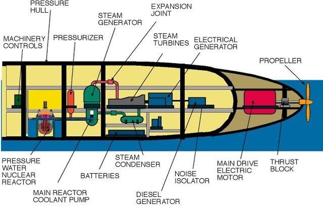 Come in una centrale nucleare convenzionale, il reattore del sottomarino genera un'enorme quantità di calore tramite la fissione nucleare per produrre il vapore necessario ad azionare una turbina che produce elettricità per ricaricare le batterie. Pertanto nei modelli più moderni e silenziosi le eliche vengono mosse da motori elettrici, alimentati da batterie, alimentate a loro volta dal reattore nucleare.