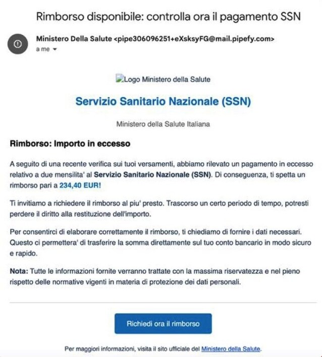 Il Ministero della Salute ha avvertito in un comunicato di un nuovo tentativo di truffa basate su finte e-mail con oggetto «rimborso per importo in eccesso» che sembrano provenire dal Ministero stesso e promettono un rimborso di oltre 230 € per un presunto errore nei versamenti al SSN (Servizio Sanitario Nazionale). Tutto fa pensare a un'opportunità da cogliere al volo, ma in realtà si tratta di una truffa ben congegnata, parte di un attacco informatico di tipo phishing. Con questo termine si indica una tecnica usata dai criminali informatici per ottenere informazioni personali o bancarie fingendosi enti affidabili. Il Ministero ha già allertato i Carabinieri del NAS, ma l’episodio resta un chiaro segnale della necessità di alzare il livello di attenzione e sviluppare un approccio critico verso la corrispondenza digitale. Per difendervi da truffe come questa è importante saper distinguere tra una comunicazione autentica e una costruita ad arte per sottrarre dati personali o denaro.