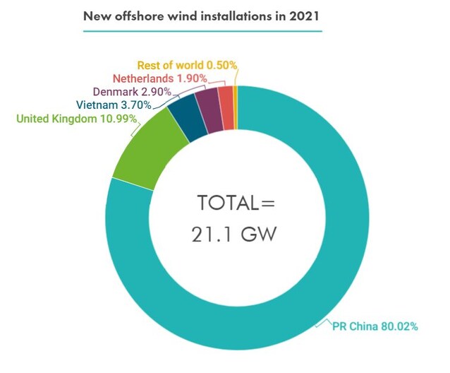 Dai dati dell’ultimo rapporto annuale disponibile del World Energy Council nel 2021 il 22,5% di nuovi impianti per la produzione di energia è stato rappresentato da installazioni di tipo eolico off-shore – per un totale di 21.1 gigawatt di potenza (ventisettemila settecentosessanta monoposto di cui sopra). La nazione che sopra ogni altra sta investendo su questa tecnologia è – poco sorprendentemente – proprio la Cina, che del totale delle nuove installazioni del 2021 ne detiene la stragrande maggioranza (80%), seguita da Regno Unito (c.a. 11%), Vietnam (3,7%) e Danimarca (2,9 %).