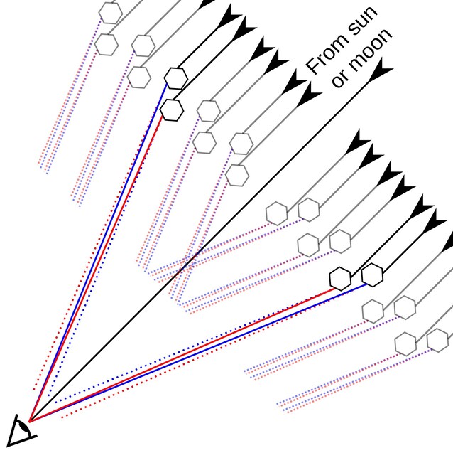 Quello che vediamo, quindi, sono tutti i raggi di luce che vengono rifratti nella nostra direzione, che per ragioni geometriche formano un cerchio attorno al Sole o alla Luna. Poiché le componenti luminose di colore diverso vengono rifratte con angoli leggermente diversi (il blu viene “piegato” un po' più del rosso), gli aloni solari e lunari ci appaiono “scomposti” nei vari colori dell'iride, un po' come avviene nel caso dell'arcobaleno.