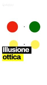 Fissa la crocetta in alto al centro tra il cerchio rosso e il cerchio verde per 30 secondi. Poi abbassa lo sguardo e fissa la crocetta in basso tra i due cerchi gialli. Se hai eseguito bene l'esperimento, vedrai qualcosa di sorprendente: il cerchio giallo a sinistra sembrerà tendere al verde o al ciano, mentre quello a destra apparirà tendente al rosso o all'arancione. Eppure sono fisicamente esattamente lo stesso colore. Come è possibile?