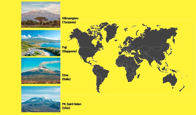 Il primo vulcano è il Kilimangiaro, un imponente stratovulcano quiescente in Tanzania, celebre per essere la montagna più alta dell’Africa nonché la più grande montagna isolata al mondo, ovvero non associata a catene montuose. A seguire troviamo un'altro vulcano quiescente, il Monte Fuji, un vulcano iconico e sacro del Giappone, la cui simmetria perfetta lo rende un simbolo nazionale.